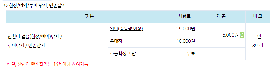 - 텐트 낚시: 사전 예약제로 운영, 잔여 좌석 있을 경우 현장 발권 가능