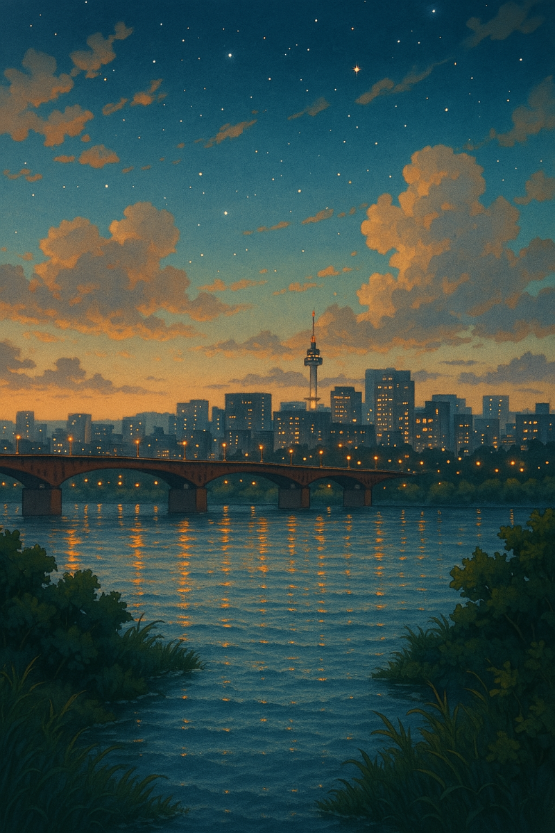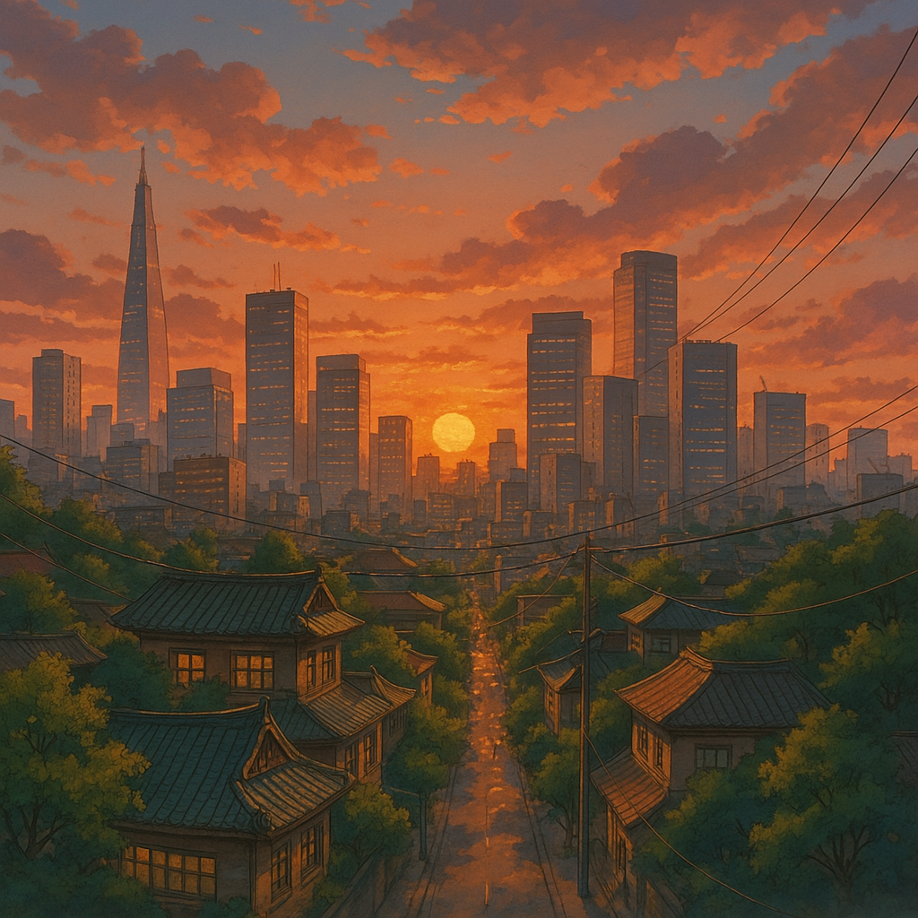 "지브리풍 스타일로 서울 한복판의 노을진 풍경을 만들어줘!"