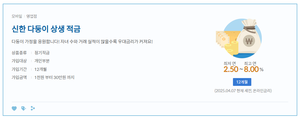 | 신한은행 | 신한 다둥이상생적금 | 8% | 기본 2.5% + 다자녀 수당 + 아동수당 수령 + 신규 고객 혜택 등 |